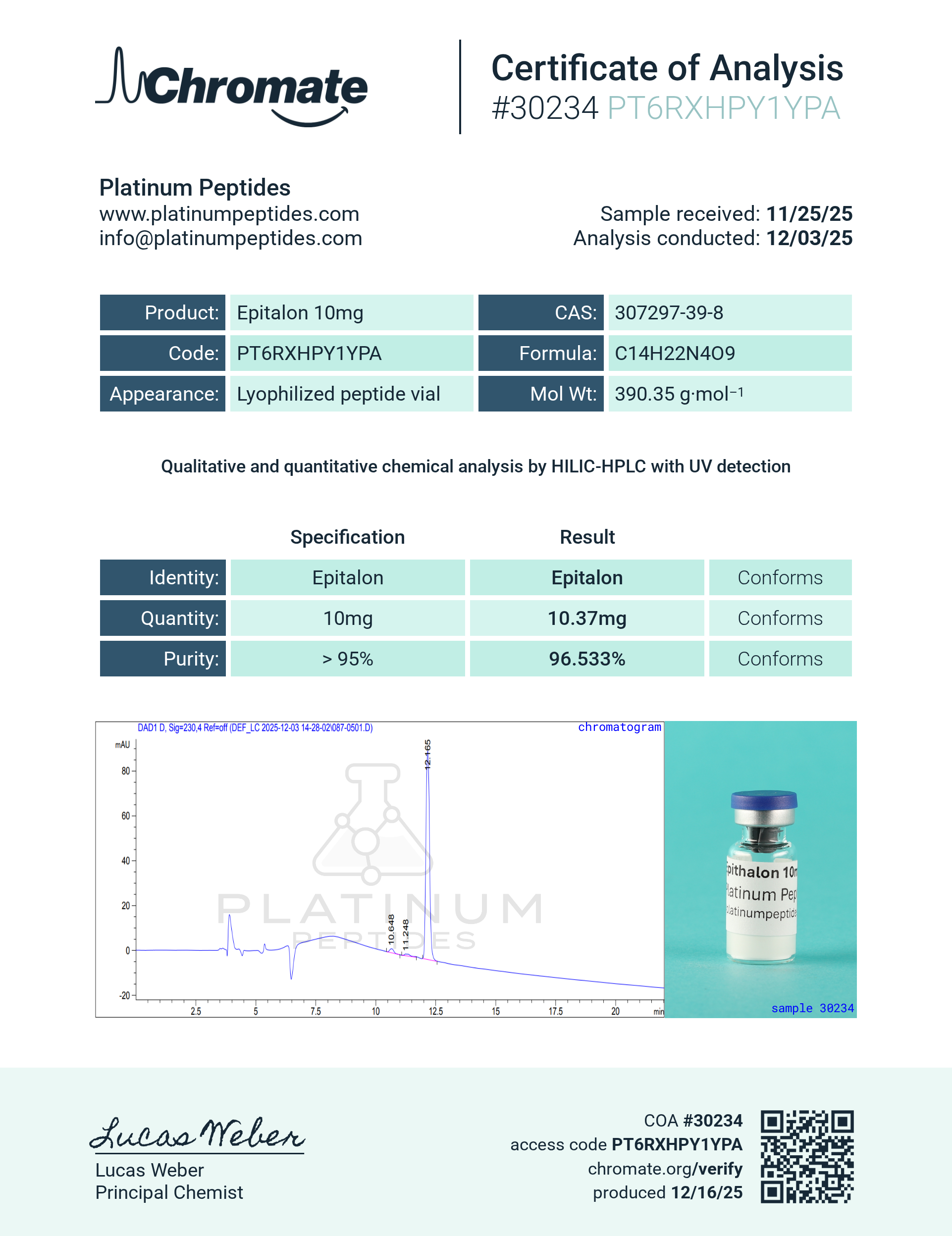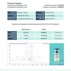 For this reason, purity results for Epithalon may fall in the mid-90% range while still conforming to identity, consistency and research-grade quality standards. Each batch is HPLC tested to conform to identity and purity