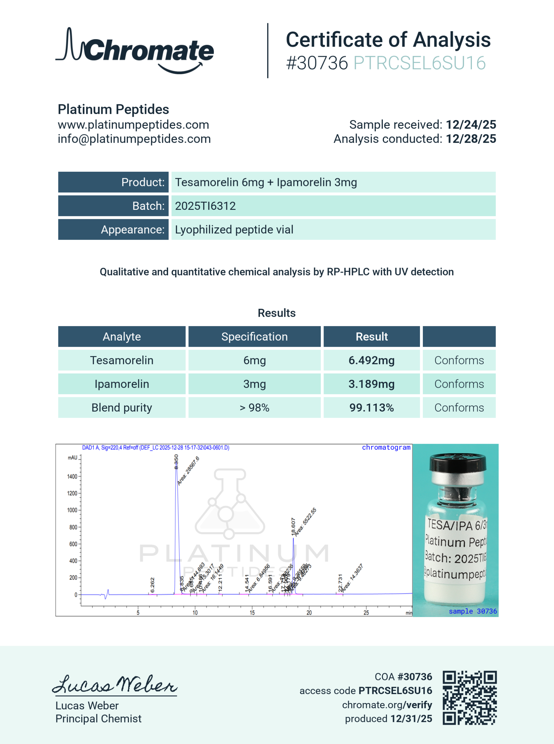 Our high-quality TESA/IPA peptide blend is available in a 6mg/3mg size. The product comes in a lyophilized powder form in a 3mL vial that requires Reconstitution Solution to reconstitute from solid to liquid form.